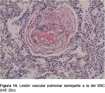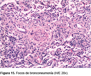 Ahora se muestran los hallazgos en los pulmones. Estos tenían un peso un poco aumentado, de 750 g contra un esperado de 715 g. Macroscópicamente mostraron algunas áreas de congestión y dilatación de la trama bronquial. Histológicamente, se observa la misma lesión que en el sistema nervioso central, representada por vasculitis con granulomas, con infiltrado inflamatorio constituido por linfocitos e histiocitos epitelioides (Figura 14). Son evidentes los granulomas y se observa necrosis de la pared. Estas son lesiones que ocluyen la luz y dañan la pared de los vasos. Hay presencia de células gigantes multinucleadas con necrosis y fibrosis. No se observaron granulomas que sugieran tuberculosis. En una tinción de Masson se puede evidenciar que hay fibrosis extensa que habla de daño crónico con fibrosis intersticial y nuevamente las lesiones plexiformes en todas las arterias y arteriolas tanto en el pulmón derecho como en el pulmón izquierdo. En otras áreas hay, además, extenso infiltrado inflamatorio constituido por leucocitos polimofornucleares dentro de la luz de los alveolos, en los tabiques interalveolares y alrededor de los bronquiolos. Este paciente presenta una bronconeumonía con extensas áreas de hemorragia, infiltrado inflamatorio además de necrosis, detritus celulares y formación incipiente de membranas hialinas (Figura 15). Además de la bronconeumonía hay depósito de tejido conectivo alrededor de los bronquiolos, es decir el paciente tiene una bronquiolitis obliterante.