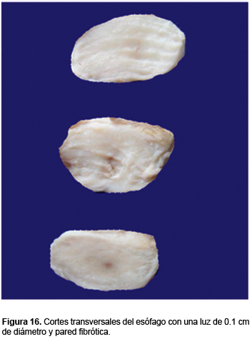 Esta es la pieza que se disecó posteriormente, se dejó el esófago y el estómago, se ve la presencia de la gastrostomía. Estos son los cortes seriados donde se observaba el esófago con una luz de 0.1 cm de diámetro, tenía una estenosis de 100% y una pared totalmente fibrótica (Figura 16).