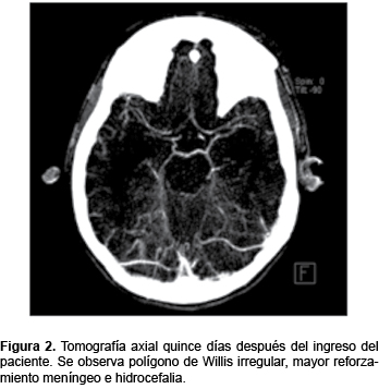 La tomografía inicial de cráneo con asimetría en puente e hipodensidad a nivel mesencefálico con un sistema ventricular normal. Al usar contraste se observó una imagen hiperdensa y reforzamiento de meninges en la tienda, con una relación de sustancia gris y blanca adecuada. El polígono de Willis se reporta normal (Figura 1). Catorce días después de realiza una nueva TAC encontrando polígono de Willis irregular, mayor reforzamiento meníngeo e hidrocefalia (Figura 2). Un mes después de su ingreso se observó la pérdida de la relación de sustancia gris y blanca, con borramiento de circunvoluciones frontales y parietales, reforzamiento meníngeo, así como múltiples áreas hipodensas con disminución de la perfusión cerebral.