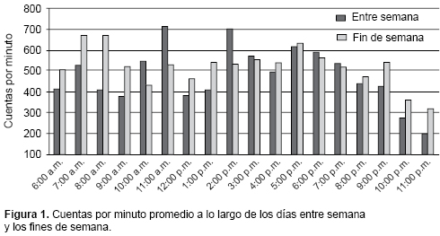 De lunes a viernes, los escolares registraron el mayor número de cuentas a las 11 y 14 horas, correspondiendo a la hora del recreo y salida de la escuela (Figura 1).* Después del horario escolar, el pico máximo de cuentas por minuto fue a las 17:00 h. Después de esa hora, el promedio de cuentas descendió constantemente. En fin de semana se observó que la AF aumentaba conforme transcurría el día. Los escolares fueron más activos durante la tarde, y el mayor número de cuentas se presentó a las 17:00 h, seguido de las 21:00 h.