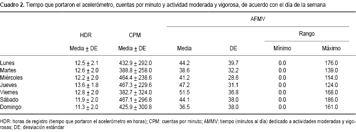Aunque el tiempo promedio en que los niños llevaron los acelerómetros siempre fue mayor a once horas (Cuadro 2), el tiempo fue menor los fines de semana. Los días con valores más altos de cuentas por minuto fueron miércoles, jueves y sábados, mientras que los días con valores más bajos fueron martes y viernes. Los días que dedicaron más tiempo a AF moderadas y vigorosas fueron viernes y jueves, mientras que los días que destinaron menos tiempo a estas actividades fueron los martes y domingos.