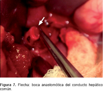 El tratamiento quirúrgico se realizó mediante la resección del quiste, colecistectomía y derivación biliodigestiva con anastomosis hepático-duodenal (Figura 5).4 Los hallazgos quirúrgicos fueron un quiste de colédoco tipo I hepático común (Figura 6) con boca anastomótica de 13 mm, de aproximadamente 2 cm de longitud desde el porta hepatis (Figura 7). El reporte de patología fue negativo para malignidad. El manejo postoperatorio incluyó ayuno por cinco días, sonda nasogástrica a derivación, inhibidor de bomba de protones, ketorolaco, cefotaxima y metronidazol. A seis meses de evolución, la paciente no había presentado cuadros de colangitis.