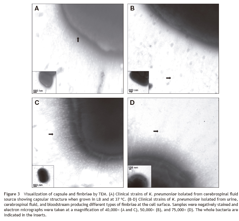 The main virulence factors associated with the pathogenesis of K. pneumoniae are type 1 fimbriae, type 3 fimbriae, and capsule.30,31 The capsule of K. pneumoniae is a structure that provides protection against bacterial phagocytosis and the bactericidal activity of serum and thus promotes nosocomial infections in the respiratory and urinary tracts. Based on the results obtained from our TEM analysis, clinical strains of K. pneumoniae isolated from HIMFG patients showed a polymeric capsule similar to previous reports for this pathogen.32 TEM results showed that fimbrial structures of different lengths, which are produced according to the source of the clinical isolate of K. pneumoniae, play an important role in the pathogenesis of K. pneumoniae.