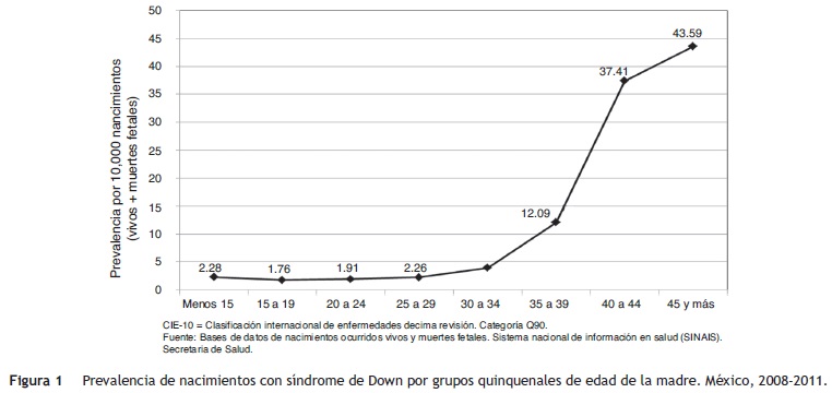 Conclusions: The importance of this report is to initiate an epidemiological surveillance of newborn cases of DS nationwide and by state using census information systems available in the country since 2008. An increased risk has been observed for having a child with DS since the mother is ≥ 35 years, as has been reported in other studies.