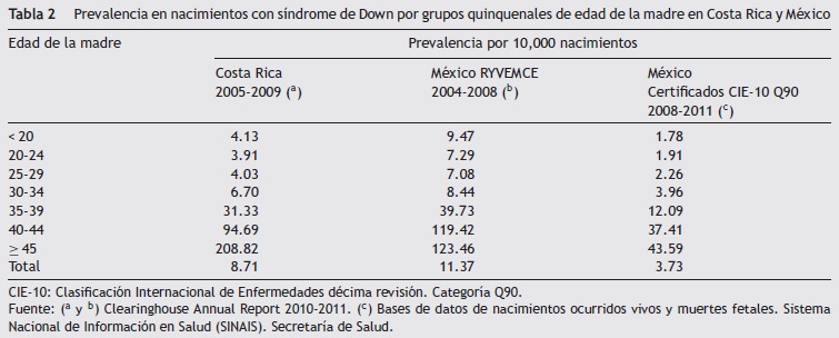 Al analizar las cifras de prevalencia del SD según diferentes fuentes de información se observó que, en México, el RYVEMCE para el total registró una tasa de 11.37 por cada 10,000 nacimientos8, y Costa Rica9 8.71 (tabla 2). Es decir, tres y dos veces más alta, respectivamente, que la reportada en este estudio, que fue de 3.73. Por grupos de edad materna, el comportamiento de la prevalencia es muy similar.