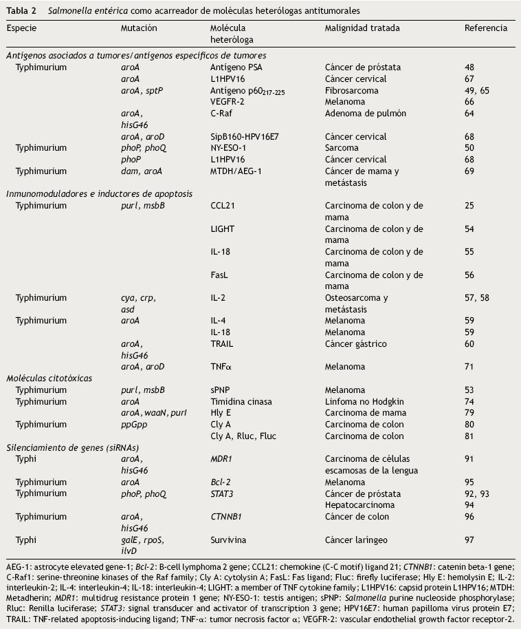 La presencia y sobreexpresión de proteínas que promueven la transformación y la tumorigénesis en las células tumorales, actualmente clasificadas como "antígenos asociados a tumores" (TAA) o "antígenos específicos de tumores" (TSA)61, han dado pauta para el empleo de S. enterica como acarreador de estos antígenos con fines profilácticos y terapéuticos8.