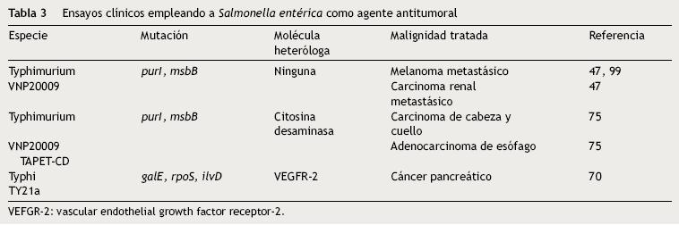 Diversos esfuerzos se han realizado para obtener cepas atenuadas de S. enterica que reduzcan los efectos secundarios en el hospedero. Con esta finalidad fue desarrollada la cepa VNP20009 de S. Typhimurium con mutaciones en los genes msbB (que afectan la formación de lípido A, reduciendo la toxicidad asociada al lipopolisacárido) y purI (que la hace dependiente de una fuente externa de adenina). Esta cepa se ha empleado en estudios clínicos de fase I en 24 pacientes con melanoma metastásico y un paciente con carcinoma renal metastásico. Los pacientes que recibieron dosis intravenosas de 3x108 UFC/m2 de la cepa VNP20009 no presentaron reacciones adversas severas. Sin embargo, la colonización del tejido tumoral fue moderada y el efecto antitumoral no fue significativo47.
