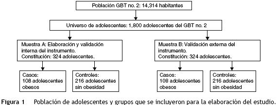Con el objetivo de captar los adolescentes que formarían parte del estudio, identificar la prevalencia y realizar la descripción de las características más relevantes de la obesidad, se visitaron los 18 consultorios médicos del Grupo Básico de Trabajo No. 2 y se registró una ficha de datos para cada adolescente con todas las variables de la investigación (Anexo 1). Como fuentes de información se tomaron historias clínicas individuales, fichas familiares, interrogatorios y el examen físico directo a los adolescentes, que incluyó la antropometría (peso, talla y el cálculo del índice de masa corporal). Se identificaron 216 adolescentes obesos. Para identificar los factores de riesgo de obesidad, se realizó un muestreo aleatorio estratificado. Se dividió a la población en dos estratos, dependiendo de la presencia de obesidad, con el objetivo de conformar dos muestras: una para la elaboración y validación interna del instrumento (muestra A) y la otra para la validación externa (muestra B). La muestra A estuvo integrada por un grupo de casos constituido por el 50% de los adolescentes en los que se identificó la presencia de obesidad (108 adolescentes) y un grupo control formado por 216 adolescentes sin obesidad (proporción de dos controles por cada caso), elegidos por muestreo aleatorio simple probabilístico (MASP) a partir de la base de datos establecida para esta investigación, utilizando el procesador estadístico Epidat 3.1. La muestra B estuvo integrado de forma similar por el 50% restante de los adolescentes con obesidad (108 adolescentes) y otro grupo de control formado por 216 adolescentes sin obesidad (figura 1). Se incluyeron adolescentes de 10 a 19 años de edad. Para el grupo de casos, se incluyeron adolescentes con diagnóstico de obesidad exógena; para el grupo control, adolescentes sin diagnóstico de obesidad.