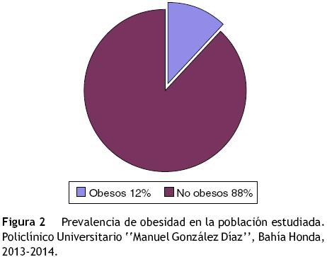 La prevalencia de obesidad en la población estudiada fue del 12% (figura 2). Hubo un ligero predominio del sexo femenino (54.2%), piel blanca (39.8%) y el área urbana (87%), aunque no se encontraron diferencias estadísticamente significativas entre los grupos comparados en ninguna de las tres variables (p > 0.05) (tabla 2).