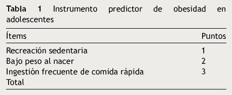 Conclusiones: El instrumento permite predecir el riesgo de desarrollo de obesidad en adolescentes con una sensibilidad aceptable y alta especificidad. Su aplicación rutinaria sería interesante en consultas de puericultura.