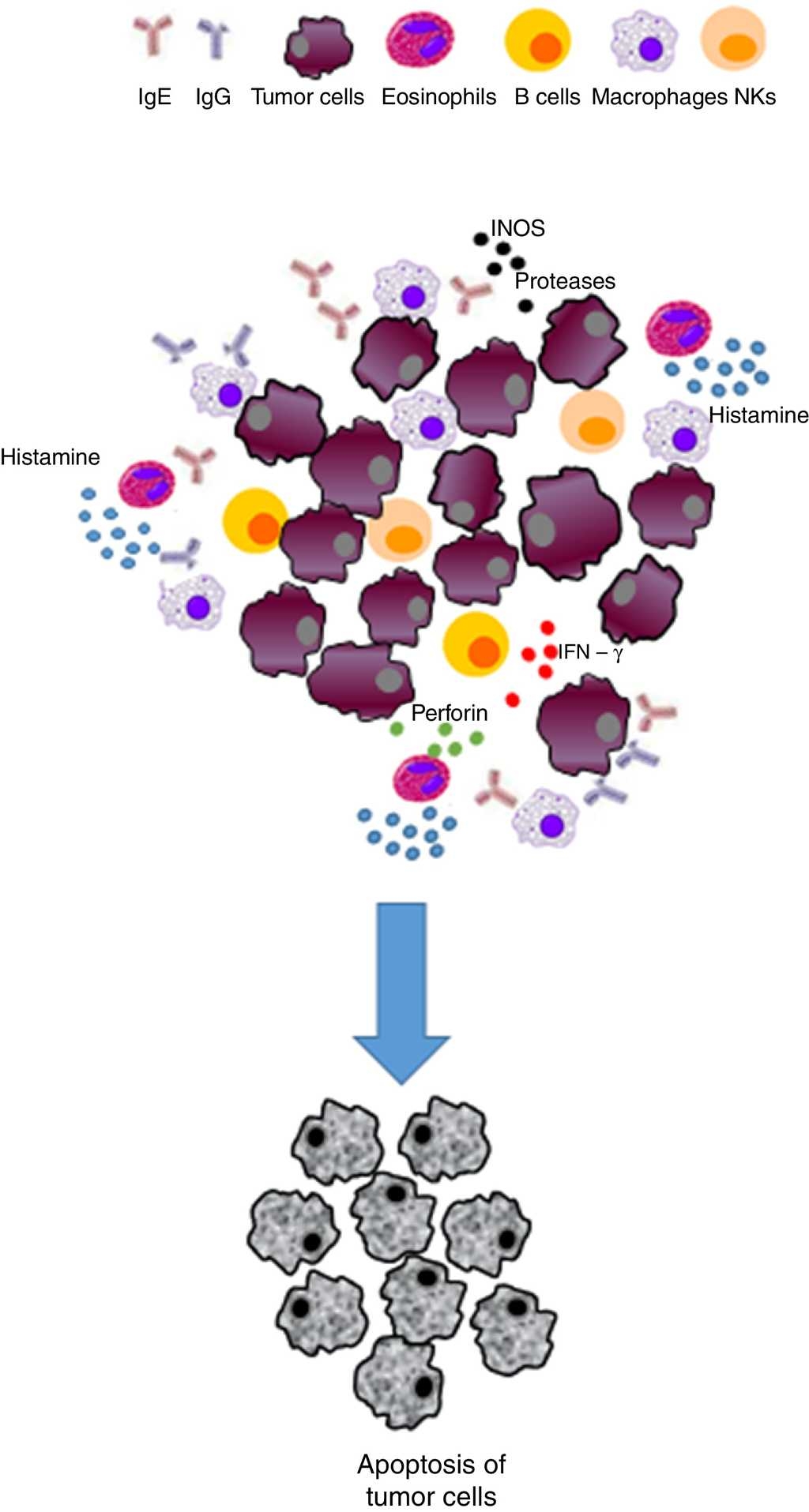 IgE has been suggested to provide protection against parasitic infections; nonetheless, this feature is controversial.32,33 Allergens that bind to IgE and interact with receptors lead to rapid degranulation of these effector cells, resulting in the release of several factors, including histamine, enzymes, and lipid mediators. The release of all these factors leads to tissue damage and an acute inflammatory response. Therefore, it might be possible that if specific IgE antibodies to a tumor antigen were present in the tumor microenvironment, such hypersensitivity reaction could lead to the death of tumor cells and phagocytosis of dead cells by antigen presenting cells (APC), such as dendritic cells (DC) and macrophages. Furthermore, T cells could then be activated by these APC, leading to an adaptive immune response of T-cells against the tumor. This immune response has the potential to be specific, not only for tumor-specific antigen but to other tumor antigens because of epitope spreading—a phenomenon in which an immune response is triggered to epitopes or antigens other than the epitope or antigen that was initially targeted.34 Importantly, IgE may also mediate antigen presentation through the interaction with APC and expressed FcɛRs.24