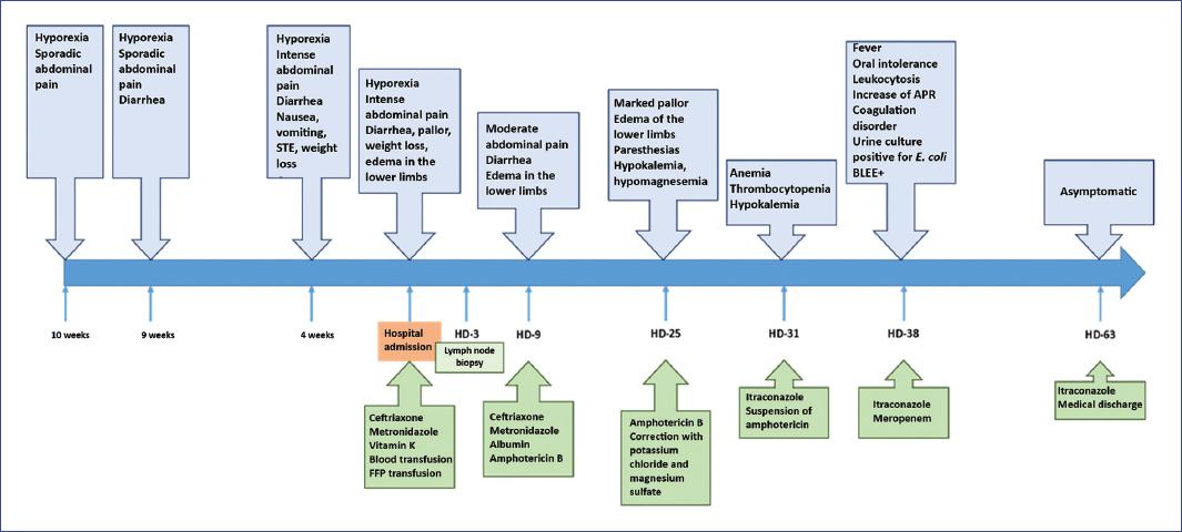 Finally, the patient was discharged on HD63 to continue treatment with itraconazole and medical check-ups in the primary care unit.
