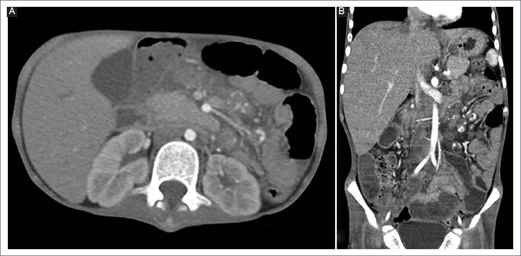 During the evolution of the disease, the patient presented abdominal pain of moderate intensity during feeding, persistent edema in the lower limbs, and a fecal flow between 2.5 and 4.5 g/kg/h, requiring replacement of losses with polyelectrolyte solution. On HD9, there was a slight improvement in the coagulation profile, with persistent hyponatremia, increased C-reactive protein, and decreased serum albumin values (Table 1), so it was decided to administer human albumin at a dose of 0.5 g/kg/day for three consecutive days.