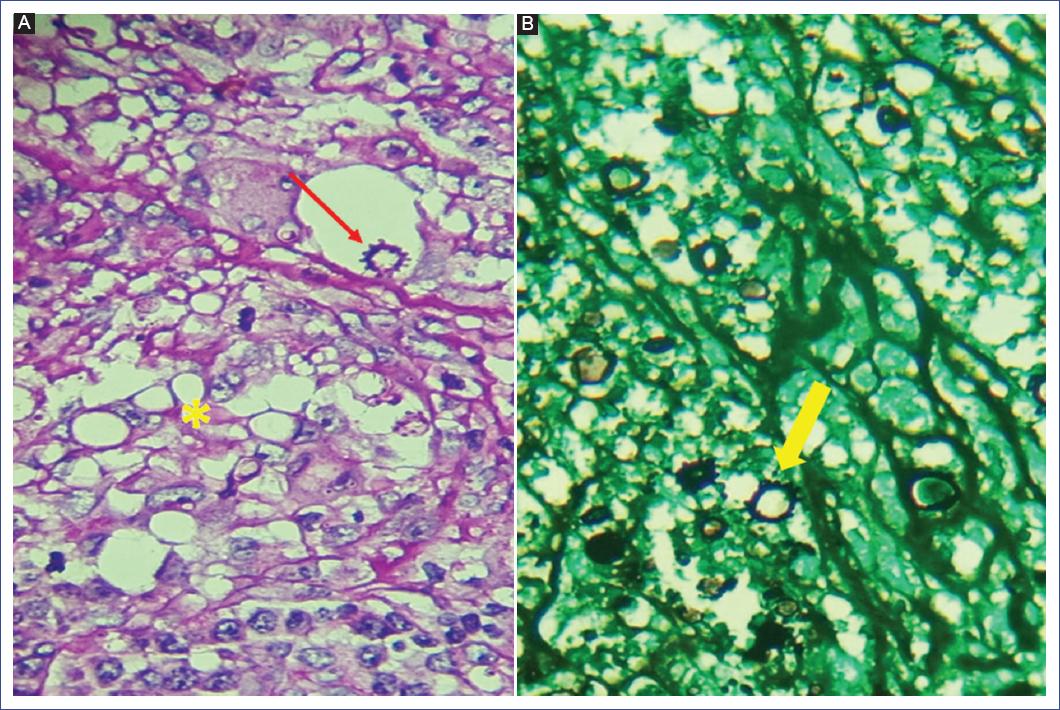 Figure 3 Lymph node biopsy. A: hematoxylin-eosin (HE) stain 400X. Chronic granulomatous inflammatory process (yellow asterisk) where round yeasts are observed (red arrow). B: special methenamine-silver stain 400X. Multiple multigemant yeasts in the shape of a ship’s rudder corresponding to Paracoccidiodes are observed (yellow arrow).