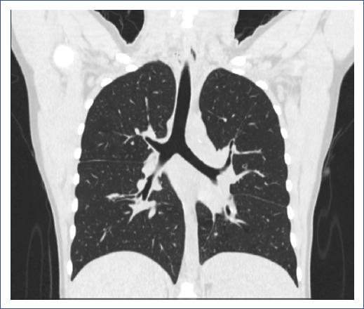 Figure 1 Computerized axial tomography at 17 years old, showing right upper solitary nodule, bilateral cylindrical lamellar atelectasis and bronchiectasis, left septal thickening, and axillary nodal hypertrophy.