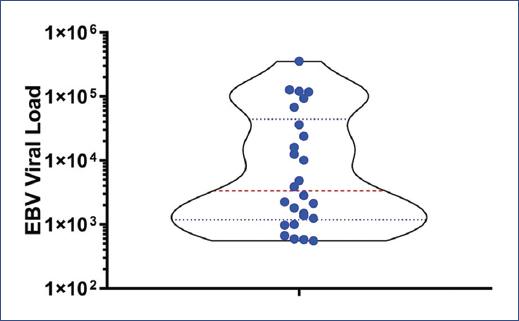 Figure 1 Distribution of Epstein-Barr virus viral load among the 26 patients included in the analysis. Viral load values are presented on a logarithmic scale to accentuate the variability observed between individuals. Each data point on the graph corresponds to the viral load of a specific patient.