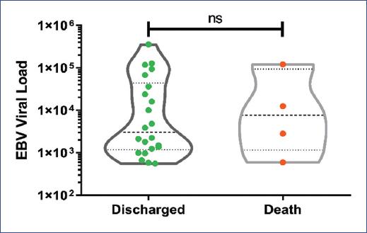 Figure 2 Comparison of Epstein-Barr virus load in patients who succumbed to the infection with those who were discharged. The viral load values were logarithmically scaled, with each data point representing an individual patient. Mann–Whitney U test for non-parametric data, without normal distribution, statistical significance was determined with a p = 0.05.