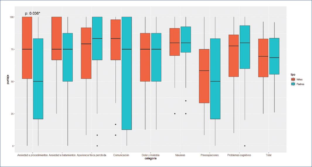 En relación con los resultados del PedsQL se observó que el puntaje total global para los niños fue de Q2 (cuartil 2 o mediana) de 69.4 y un rango intercuartílico (RIC) 53.5-83.1 y en los padres un puntaje similar, Q2 de 68.5 (RIC: 55.6-83.5). Al analizar cada una de las dimensiones se evidenció que los puntajes más altos en Q2 fue de 80 para náuseas tanto para los padres como para los niños (RIC: 72.5-92.5) y (RIC: 70-91.3), seguido de apariencia física percibida en niños (Q2: 79.2; RIC: 52.1-91.7) y en padres (Q2: 83.3; RIC: 66.7-100) (Fig. 1). Se exploró si existían diferencias en el puntaje global y por dimensión entre los padres y los niños. La única diferencia estadísticamente significativa fue la dimensión de ansiedad en los procedimientos (p = 0.036) siendo el puntaje de la mediana más alta en el grupo de niños (Q2: 75; RIC: 52.1-100) y en padres menor (Q2: 50; RIC: 20.8-83.3) (Fig. 1). En las dimensiones restantes se observan puntajes similares para ambos grupos.