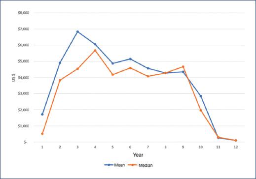 Finally, the diagnostic imaging and laboratory studies component presents a mean of USD 308.0 (SD = 52.0) and a median of USD 297 (262.8-353.9). In this component, we observe that costs decrease consistently over time; in the 12th year, the cost represented 25% of the initial year’s cost (Fig. 2D).