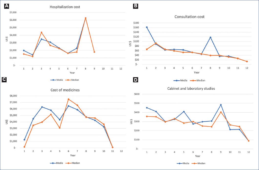 Table 1 reports the total DMCs and by component for each of the 12 years, finding a mean of USD 4,555.2 (SD = 1,456.7) in the first 10 years, and the relative weight of the components of consultation, hospitalization, imaging, and laboratory studies, and finally medications of 1.8%, 8.0%, 8.4%, and 82.7%, respectively.