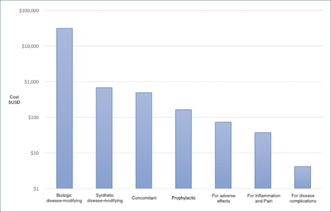 The cost of biological disease-modifying drugs represented 95.6% of the DMC within the medication component and is reflected in the 2nd year of treatment. Therefore, it is important to include generic medications or review purchase prices by Mexican public health institutions from pharmaceutical companies.