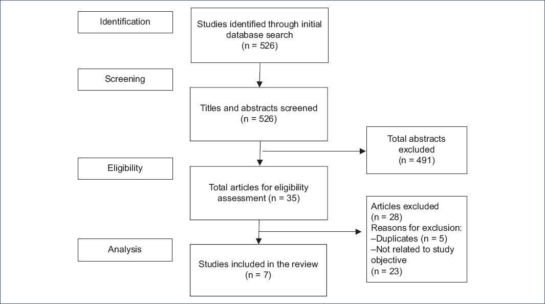 During the literature search, 526 articles were identified. 519 were eliminated (5 due to duplication and 514 due to lack of relevance to the study objective) (Fig. 1). The final sample consisted of 7 articles: 3 clinical trials and 4 cohort studies. The clinical trials obtained a high-quality level according to the GRADE methodology. Regarding the cohort studies, 3 obtained a low-quality level and one moderate (Table 1).