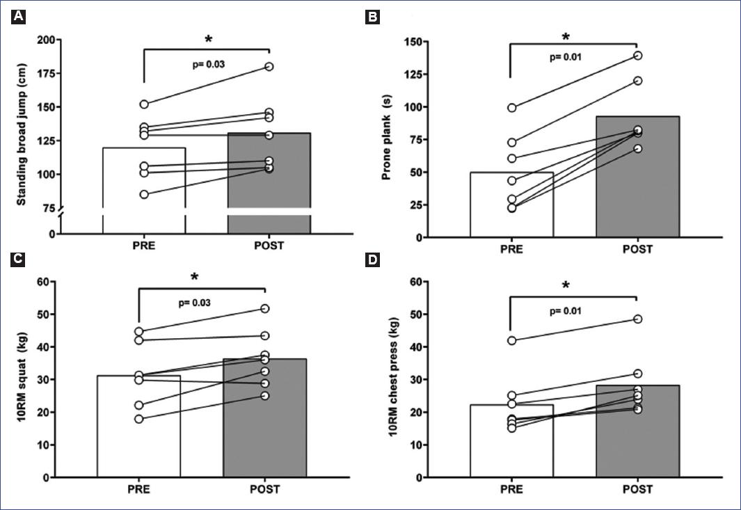 Significant differences were observed in the pre-to-post-intervention in the standing broad jump, increasing from 29.0 (103.5-152.0) to 129.0 (107.5-180.0) cm (p = 0.03) figure 1A. Similarly, the prone plank increased from 43.5 (26.0-99.2) to 81.5 (79.9-139.3) s (p = 0.01) figure 1B, the 10RM squat increased from 31.3 (25.9-44.7) to 36.0 (30.6-51.7) kg (p = 0.03) figure 1C, and the 10RM chest press increased from 17.9 (17.0-41.9) to 25.1 (22.6-48.5) kg (p = 0.01) figure 1D. No significant differences were observed for the push-up test (p = 0.06).