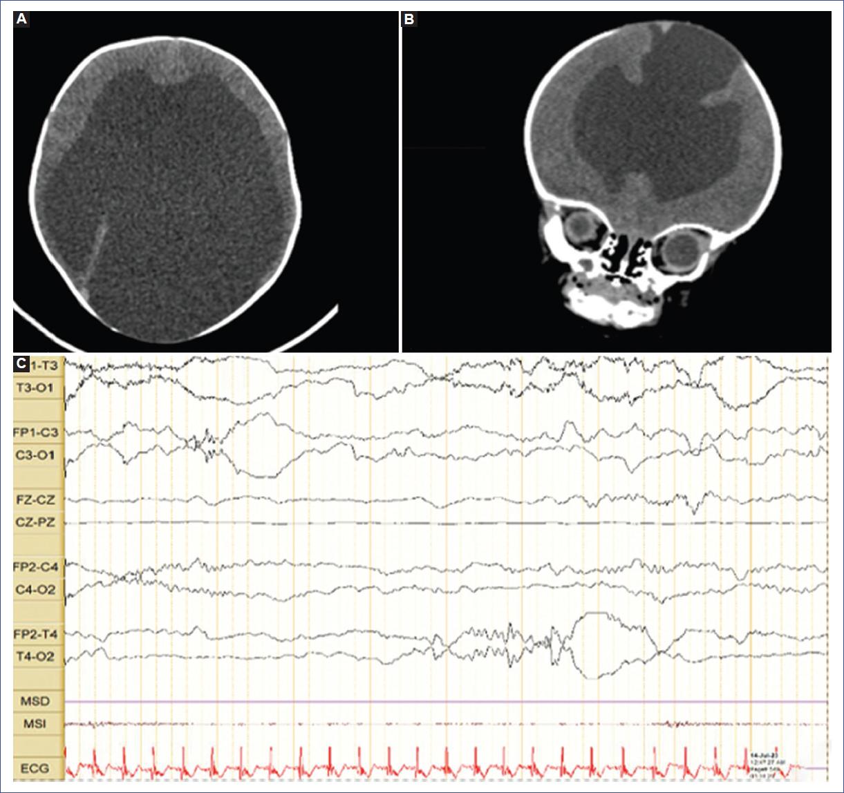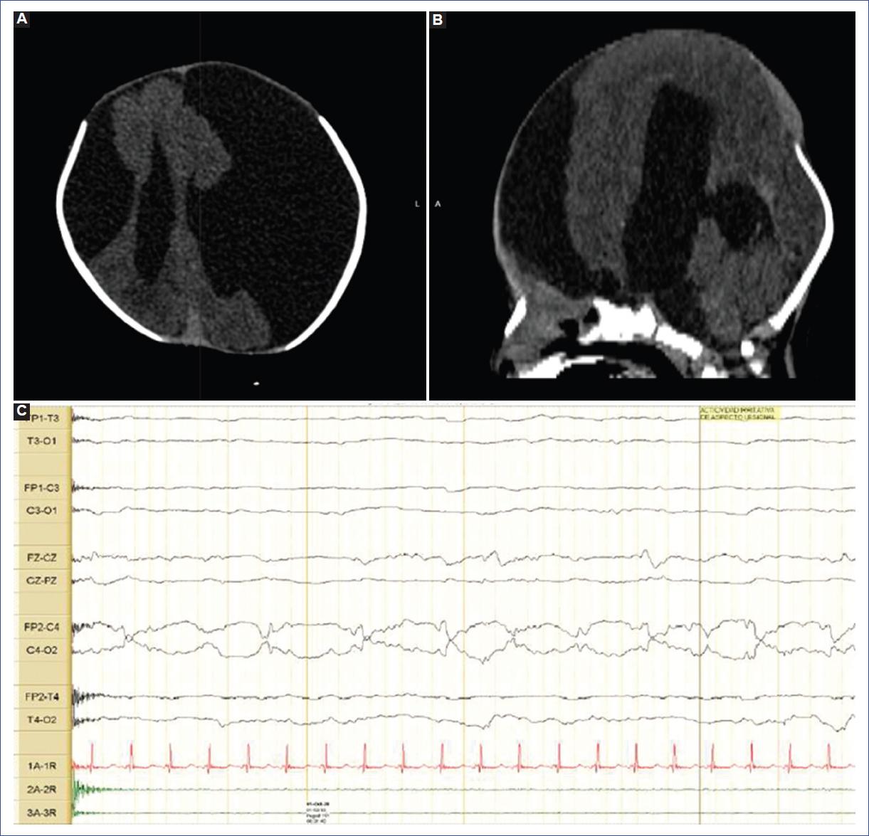 Por el compromiso neurológico, se realizó una tomografía computarizada (TC) de cráneo simple que evidenció una hendidura que comprometía las regiones frontotemporales de ambas convexidades, comunicación del espacio subdural con los ventrículos laterales y ausencia del septo pelúcido, y el tercer ventrículo dilatado. Con estos hallazgos se estableció el diagnóstico de esquizencefalia de labio abierto bilateral (Fig. 1 A y B). Presentó crisis epilépticas dentro de las primeras 24 horas de vida, por lo cual se inició manejo con fenobarbital con dosis de impregnación de 20 mg/kg y luego de mantenimiento entre 5 y 7.5 mg/kg/día. Se realizó un videoelectroencefalograma que mostró pobre diferenciación del ciclo sueño-vigilia, actividad epileptiforme de aspecto lesional central derecha y dos progresiones eléctricas bilaterales hasta por 20 segundos con manifestación clínica de movimientos clónicos del brazo izquierdo (Fig. 1C). Por lo anterior, se adicionó levetiracetam a dosis de 30 a 60 mg/kg/día, pero persistió la clínica de crisis epilépticas, por lo cual se adicionó vigabatrina a dosis de 50 mg/kg/día cada 12 horas. Por su inestabilidad clínica no se pudo realizar resonancia magnética (RM) cerebral. Los estudios complementarios, como ecocardiograma y ecografía abdominal, fueron normales. La valoración de oftalmología reportó el hallazgo de sinequias posteriores, pupila fija adherida al cristalino e hipoplasia del nervio óptico bilateral. Fue valorado por genética, donde solicitaron cariotipo bandeo G como estudio inicial, el cual fue 46,XY. Durante su estancia cursó con trastorno grave de la succión y la deglución, y convulsiones recurrentes de difícil manejo. Teniendo en cuenta el deterioro clínico, el compromiso grave por TC y el mal pronóstico funcional del paciente, el caso fue llevado a junta de ética, donde se determinó iniciar cuidado paliativo y 33 días después del ingreso falleció.