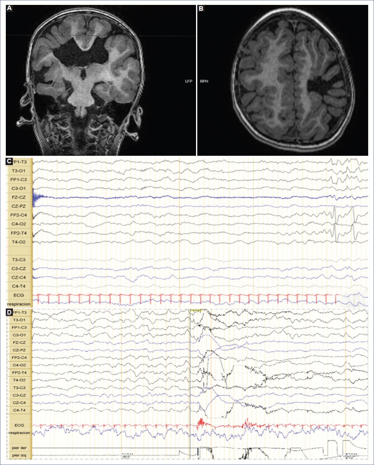Figura 2 Caso 2. A y B: resonancia cerebral simple, cortes coronal y axial. Se observan esquizencefalia de labio abierto en las regiones frontal izquierda y en la transición parietotemporal derecha, con polimicrogiria frontoparietal bilateral de predominio izquierdo y ausencia del septo pelúcido. C y D: videoelectroencefalograma que muestra actividad interictal ocasional en forma de complejo punta onda irregular de mediana amplitud en la región centrotemporal derecha (C), y registro de espasmos epilépticos (D) sin patrón de hipsarritmia.