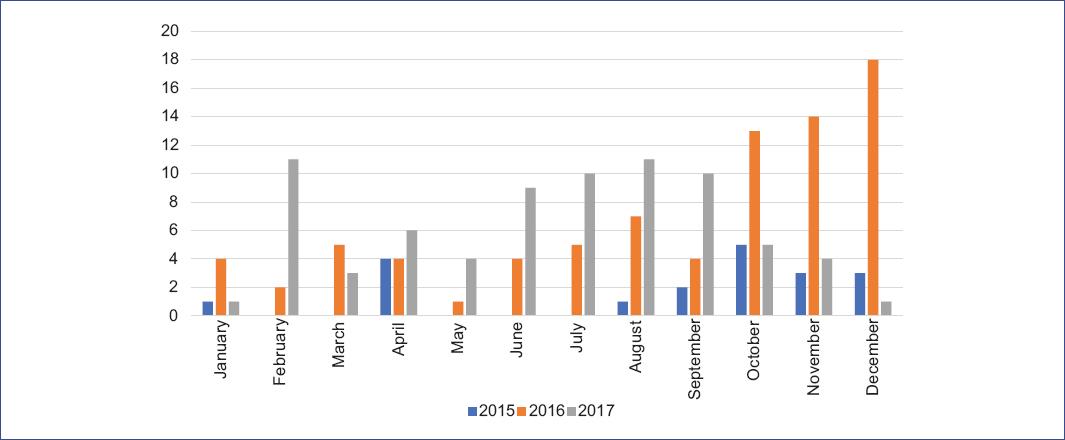 Children had a median hospital stay of 5 days (IQR 3-8). Patients were admitted for symptomatic hMPV all year round, and distributed in the two seasons of the country: summer and rainy season (mid November to mid April). However, cases were likely to peak during October, November and December (32%), creating a tendency of greater number of hospitalizations in the second semester (Fig. 1). White race was predominant with 93.6% of patients, 3.7% were black and 2.7% indigenous.