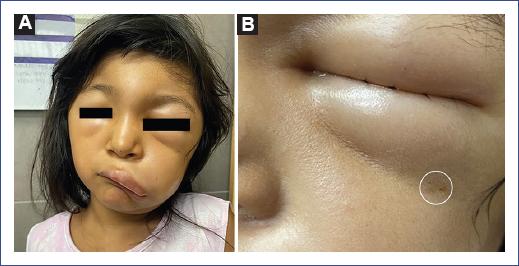 Al ingreso tenía frecuencia cardiaca de 110 latidos por minuto, frecuencia respiratoria de 20 respiraciones por minuto, temperatura de 36,5 °C, saturación de oxígeno del 99% (FiO2 21%) y un peso de 22 kg. En la exploración física presentaba leve palidez de piel y mucosas, dos orificios puntiformes debajo del párpado inferior y edema en la cara a predominio de párpados, labios y cuero cabelludo (Fig. 1). No presentaba adenopatías cervicales, axilares ni inguinales. El murmullo vesicular pasaba bien en el tórax y el abdomen era blando, depresible, sin dolor a la palpación. En el resto de la exploración no se observaron alteraciones.