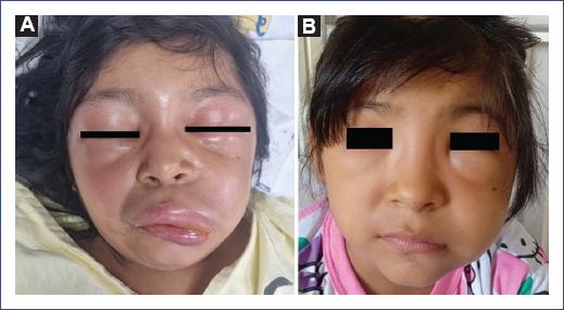 La paciente evolucionó favorablemente y recibió el alta al séptimo día con un leve edema palpebral para continuar con antihistamínicos (clorfenamina y levocetirizina) por vía oral por 7 días (Fig. 2B).