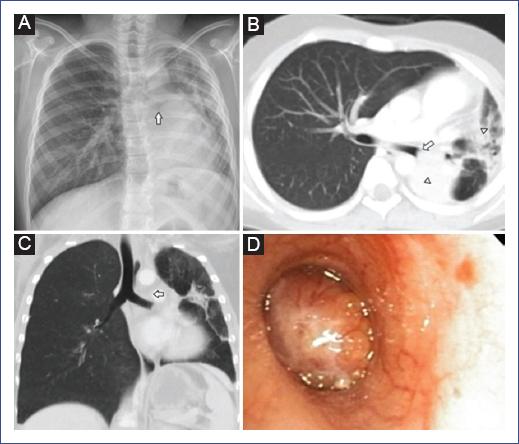 Figura 1 Carcinoma mucoepidermoide pulmonar izquierdo en un niño de 9 años con hemoptisis recurrente. A: la radiografía de tórax posteroanterior muestra opacidad retrocardiaca izquierda con un corte abrupto del bronquio principal izquierdo (flecha), infiltrados heterogéneos y disminución del volumen pulmonar izquierdo. B: imagen axial de la tomografía de tórax con contraste que muestra una masa endobronquial (flecha) que ocluye totalmente el bronquio principal izquierdo, áreas irregulares de alta densidad en segmentos de la língula y lóbulo inferior izquierdo en relación con atelectasia (puntas de flecha). C: la reconstrucción multiplanar coronal muestra una masa dentro del bronquio principal izquierdo (flecha), con disminución del volumen pulmonar izquierdo. D: la broncoscopia muestra tumor polipoide endobronquial con vascularidad, ocluyendo completamente el bronquio principal izquierdo.