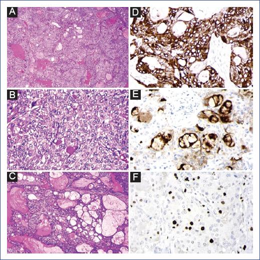Figura 2 Fotomicrografía que muestra el diagnóstico confirmado de carcinoma mucoepidermoide pulmonar. A: los cortes histológicos muestran una neoplasia epitelial constituida por dos componentes: sólido (epidermoide) y quístico (glandular) (H&E, 4x). B: el componente epidermoide está conformado de células intermedias o escamosas inmaduras, con áreas de células claras y ausencia de atipia nuclear (H&E, 10x). C: el componente glandular consta de estructuras acinares bien diferenciadas revestidas por células secretoras de mucina (moco) (H&E, 10x). Análisis inmunohistoquímico. D: la CK-PAN muestra una intensa positividad del componente epitelial (40x). E: CEA tinción citoplásmica en algunas células tumorales (40x). F: Ki-67 positivo en el 3-5% de las células tumorales (40x). CEA: antígeno carcinoembrionario; CK-PAN: panqueratina; H&E: hematoxilina y eosina; Ki-67: antígeno Ki-67.