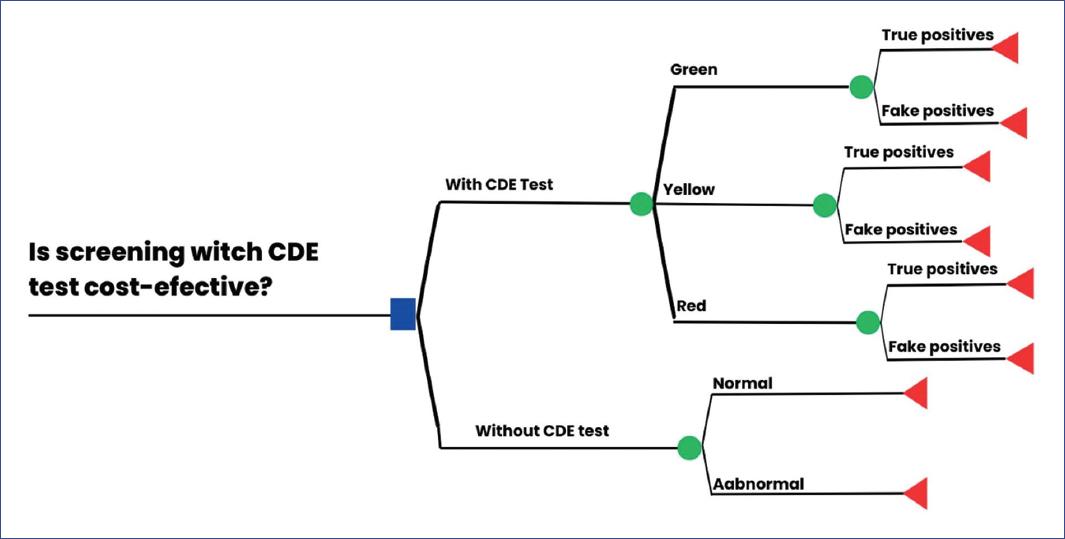 The graphical representation of the statistical model is depicted in the decision tree (Fig. 1). The model starts with a square symbol, representing the key question to be answered. The first two branches divide the population into two groups: individuals assessed with the CDE test and those assessed without the CDE test. This is followed by a probability node (green circle).