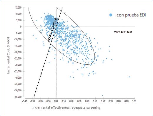 Figure 3 further illustrates the incremental cost-effectiveness ratios (ICERs) through the distribution of incremental costs and incremental effectiveness associated with the CDE screening strategy. The results confirm that the CDE test consistently outperforms the standard approach, delivering improved outcomes at reduced costs in most scenarios. In addition, the strategy is well within Mexico's willingness-to-pay (WTP) threshold, reinforcing its feasibility and economic justification for implementation.