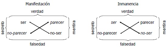 [...] la categoría de la veridicción está constituida por la puesta en correlación de dos esquemas: el esquema parecer/no-parecer es llamado manifestación y el de ser/no-ser, inmanencia. Entre estas dos dimensiones de la existencia se cumple el "juego de la verdad": inferir la existencia de la inmanencia a partir de la manifestación es estatuir sobre el ser del ser. (Greimas y Courtés, 1979: 434.)