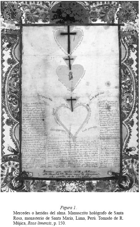 El testimonio gráfico visual legado por la santa limeña a principios del siglo XVII es de suma importancia para la reflexión antropológica en torno a las imágenes.7 Sobre un pliego se lee lo siguiente: "mercedes echas todas a un enamorado corazón, tiernamente de Dios, a una esclava de Christo indigna de ser contada entre los hijos de Dios, estampadas aquí con particular luz del cielo. La corrección pide del yerro."8 Y más adelante, según palabras de la santa limeña, "[...] en estos ultimos años habrá unos cinco años que recibo del Señor las mercedes que en este medio pliego de papel e puesto por inspiración del Señor y esperiencia en mi propio corazon aunque indigno."9 Sobre el pliego, estampados con mano propia se hallan tres corazones de papel en sucesión vertical (fig. 1).10 Estos contienen cruces de tela que han sido sobrepuestas por la santa misma, agregando inscripciones que nos orientan sobre el sentido de esta composición. Brevemente se trata de los tres primeros pasos que constituyen la preparación para el desposorio místico. Primero, el corazón de Santa Rosa es herido con lanza de acero; en segundo término, descansa Jesús en su corazón y finalmente Dios llena el corazón de amor que se alza a volar hacia Dios. El alma, en pocas palabras, entra en contacto con el amor divinio y es encendida por él. Pero es un alma que se manifiesta muy corporalmente. En esta interacción comunicativa, entre el sentir de Rosa y su necesidad de expresión, el cuerpo ocupa un lugar importante al ser sede de la experiencia y manifestarse visualmente a través del lugar de residencia de los sentimientos por excelencia: el corazón.11 Sobre el segundo pliego, que viene a ser la continuación del primero, Rosa detalla los pasos a seguir a través de la escala espiritual de ascención mística que se compone de quince grados confeccionados en tiras de papel y culmina con el encuentro de lo divino (fig. 2). En la parte inferior del pliego se lee anotado con letra manuscrita: "Estos son los grados de amor de Dios; en que ardía N.M.S. Rosa y las grandes mercedes que recibió de N. Sr. Y por su inspiración los esculpió en los corazones de estos medios pliegos; de su letra y puño escritos por Gloria de Dios." Como lo ha señalado el historiador Ramon Mújica, las composiciones de Rosa derivan de algunos grabados pertenecientes al libro de emblemas Idea vitae Teresianae, de autor anónimo y publicado en Amberes a principios del siglo XVII.12