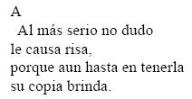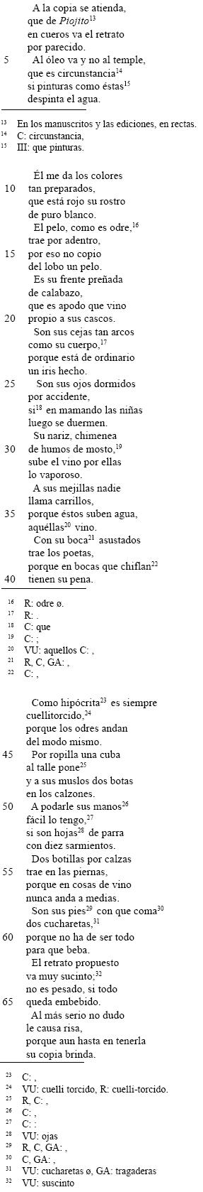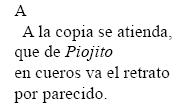 La segunda estrofa de A (sin correspondiente en B) comienza con la locución usual en las tribunas judiciales «a la copia se atienda» para advertir que debe prestarse respeto y consideración "a la copia [...] en cueros va el retrato", copia escrita semema 'apógrafo' que actualiza los semas inherentes /réplica/63 y /desnudez//64 del retrato del borracho gracioso apodado Piojito a ser descrito en las estrofas que siguen. Pero desde el punto de vista contextual <copia>, en razón de su polisemia preservada aquí por ese contexto, indexa en el taxema //trasunto// (1).
