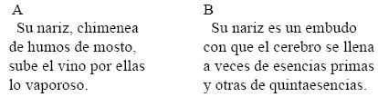 La breve excursión sincrónica por los dominios de la lengua de época que acabamos de ofrecer nos ha permitido constatar, en la figuración general de la faz del beodo Piojito del poema tutor A, la actualización del semema 'encarnación'74 y el sema inherente /vinosidad/; al contrario, en el poema variante B sólo se procura diseñar el bosquejo de un borracho corriente, banal, sin dotes especiales: es un simple, un achispado. Lo que podríamos llamar «su descriptura» se encargará de contener esas perfecciones (de facto, imperfecciones) mediocres por ser imaginadas en potencia, es decir, "todas ellas" estarían envalijadas pero latentes ("dejando / embebidas"). Notemos que "embebidas" es, en este contexto, una lexía anfibológica pues alude, por un lado, al semema 'embobamiento' y su sema inherente / agnosia/75 y, por otro, al semema 'impregnación' y su sema inherente /vinosidad/.76