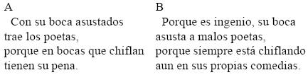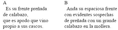 En cambio, en los dos versos finales del poema variante B se lee que hay "evidentes sospechas" semema 'conjetura' de que la "espaciosa frente" del borracho que se pretendía poeta se halle desceñida pero encinta "con un grande / calabazo en la mollera", o sea en "la parte más alta del casco de la cabeza" (DA), todo lo cual actualiza en el semema 'conjeturar' el sema aferente que también obra como inherente /inepcia/.94