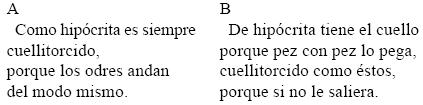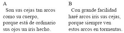 En cambio, en el poema variante B el enunciador menciona su propia facilidad de palabra, una elocuencia desenvuelta ("con grande facilidad / haré"), para enunciar un lugar común, la seudocausalidad ("porque") que enyuga la analogía metafórica entre "arcos iris" y "cejas": los ojos del borracho que se suponía poeta entreven el mundo a través de dichos arcoscejas con la visión deformada por el aturdimiento ("en tormentas") de la embriaguez semema 'turbación', sema inherente /obnubilación/, ironía comparada, mutatis mutandis, a los episodios de la mítica grecoromana en que el arco iris es producto de la distorsión de la luz solar al atravesar las nubes y la lluvia en una tempestad.97