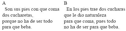 A simple vista y no obstante su diferente extensión, los dos poemas tienen una predisposición textual semejante: por un lado, ambos se inician con una introducción (y el primero además cuenta con una conclusión) que presenta el motivo temático o leitmotiv55 figurativo y, por otro, en ambos continúa en estrofas paralelas la configuración del borracho pergeñado de cuerpo entero,56 de la cabeza a los pies. Pero si también las dos composiciones obedecen a las mismas reglas retóricas del romance, debemos anotar una diferencia: los subtemas del trasunto y la efigie excluidos de B establecen en A, entre la primera estrofa y las dos últimas, una rección anafórica invertida, como nos será dable observar en su momento.
