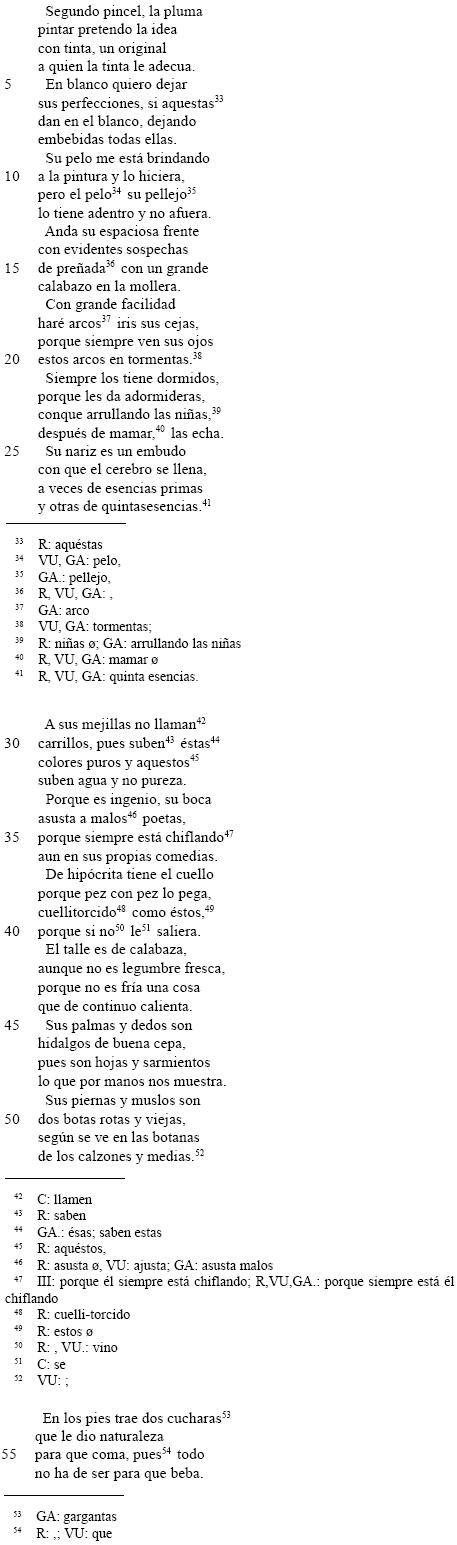 65 Tal es el segundo significado de <copia> que incluye el DA, "pintura hecha a imitación de otra en todo rigor del Arte", y trae la expresión "ajustar la copia al original" [énfasis nuestro]; véase también en R el verso 17 del poema 244 dedicado A un pintor que retrataba a una dama y la miraba con antojos, p. 430. Este sentido se reitera en el verso 15 de A y, como veremos oportunamente, sobre todo en su estrofa final.