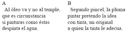 Las primeras cuartetas de A y B se inspiran, sin duda, en el Ut pictura poesis de Horacio (1960: 10811082), pero las comparaciones varían. Así, en el poema tutor A se compara los //materiales// más empleados por el pintor y se establece una oposición contradictoria entre ellas: el dominio de la //pintura// del borracho gracioso será "al óleo" lo que, por el contexto inmediato, implica el semema 'durable' antitético del semema 'efímero' correspondiente "al temple" que "despinta el agua".57 Sin embargo, como aquí las lexías <óleo> y <temple> se transfieren por metonimia, en tanto comparantes (o foro) al retrato del borracho gracioso, sus sememas se instalan precisamente en esa factura ("pinturas como éstas"), es decir, en referencia al comparado presupuesto (o tema), el dominio //escritura//, todo lo cual permite deducir una proporción sinecdótica que intercambia lo concreto por lo abstracto: en esta "circunstancia",58 <óleo> y <temple> transfieren sus respectivos atributos de calidad opuesta 'permanente' vs. 'efímero' para diferenciar metonímicamente dos tipos de //escritura//: