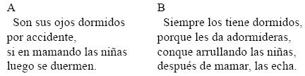 El motivo temático de ambas coplas es el tópico del sueño del borracho y la resaca consiguiente, cliché resumido por la locución «dormir uno el vino» que equivale a dormir mientras dura la borrachera o después de ella. Es más, ese mismo sueño se enuncia formal y retóricamente en la estrofa de A con un isolexismo ("sus ojos dormidos"; "luego se duermen") que encuentra su contrapeso en la paronomasia de la segunda ("dormidos"; "adormideras"), e incluso en las dos estrofas el tema compartido "sus ojos" explícito en A pero implícito en B por remisión catafórica ("los") al tercer verso de la estrofa precedente acepta como foro una lexía ambigua: "las niñas". En efecto, a la anfibología de <niñas>.