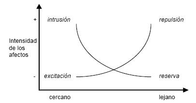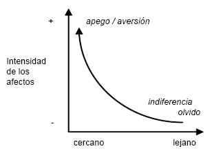La distancia puede generar un aumento de la intensidad, pero después de un cierto intervalo "umbral", la intensidad eufórica (el apego sentimental) comienza a declinar y la intensidad disfórica (la desconfianza nacida de la incertidumbre) termina por debilitarse y se comienza a olvidar que existe un conflicto con alguien que se encuentra demasiado lejos como para que se perciba como una verdadera amenaza. Y en el esquema contrario, se sabe que la proximidad puede acabar con cualquier sentimiento y hacer descender el nivel de intensidad afectiva a niveles que se conocen bajo el nombre de "costumbre". Por otra parte, los enemigos más encarnizados, a fuerza de frecuentarse, llegan a veces a formas sorprendentes de connivencia, de afinidad o incluso de acomodación.2 Lo que conduce al esquema siguiente: