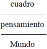 Para captar mejor de qué se trata, hay que dejar de creer que los cuadros de Magritte muestran el Mundo. Magritte ha tenido el cuidado, al menos una vez, de decir (en una carta a Rapin) que esa asimilación constituía una interpretación errónea de sus intenciones: "Los cuadros que amamos [...] no muestran objetos" (EC, 377 [1956]), e inmediatamente antes: "Los objetos representados en un cuadro (como debe ser) NO SE MUESTRAN" (ibid.). Entre el Mundo, sus objetos y el cuadro se interpone necesariamente el pensamiento del pintor, según una lógica que no es la lógica ordinaria de la razón. El acto de mostrar no es un acto que pone en relación dos elementos solamente, sino más bien tres: el cuadro, el pensamiento y el Mundo. Esos tres elementos están escalonados, de suerte que entre el cuadro y el Mundo, debe interponerse necesariamente el pensamiento: