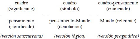 Evidentemente, no pretendemos decir que Magritte sea el único en concebir la imagen según un modo de significación auténticamente triádico, es decir, con la interposición necesaria del pensamiento entre la imagen y el Mundo el modelo de Peirce, el de Bühler o incluso el de Husserl ofrecen modelos triádicos que valdría la pena confrontar con el pensamiento magritteano acerca de la imagen. El punto que me interesa subrayar en la concepción de la significación promovida por Magritte es que ella da cuenta de un acto único: mostrar. No se trata, pues, de decir que en algunos aspectos la imagen "representa" y que en otros, "designa", según con qué se le ponga en relación. La imagen, siempre, lo único que hace es mostrar, pero eso que muestra supone una separación del pensamiento frente al mundo: la imagen instituye una relación entre el hombre y el mundo, relación definida por su función, que es la de mostrar reuniendo figuras.