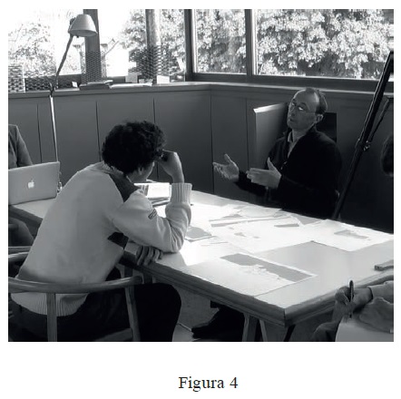 2. La fotografía, sobre todo en el caso de colaboración en copresencia, ciertamente puede darle a la sesión una mayor fidelidad en comparación con las notas; no obstante, puede mostrarse menos manipulable y menos flexible que la escritura en su función protoanalítica. Tal como las notas, la foto puede detener momentos únicos de la práctica (Figura 4) o bien, resumirlas en una visión más global. En especial, cuando una acción se detiene sobre un problema o sobre una indecisión (Figura 5). Asimismo, la fotografía puede ser definida como una textualización puntual, ya que segmenta, extrae, ordena y orienta la acción de manera diferente que la acción misma, se superpone a ella al momento de seleccionarla. A diferencia de las notas, la lectura de una foto construye un recorrido tabular, ya que se realiza por saltos analógicos entre los diferentes centros de atención y las diferentes saliencias perceptivas.